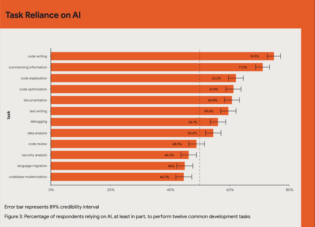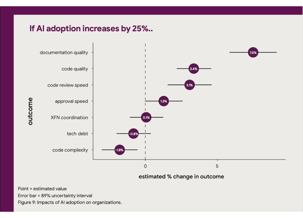 But the report’s most jaw dropping claims are in the realm of AI. The speed of its adoption in software development and it’s impact on factors as far apart as job satisfaction, review processes and code quality. But also it’s apparently negative impact on software delivery performance.